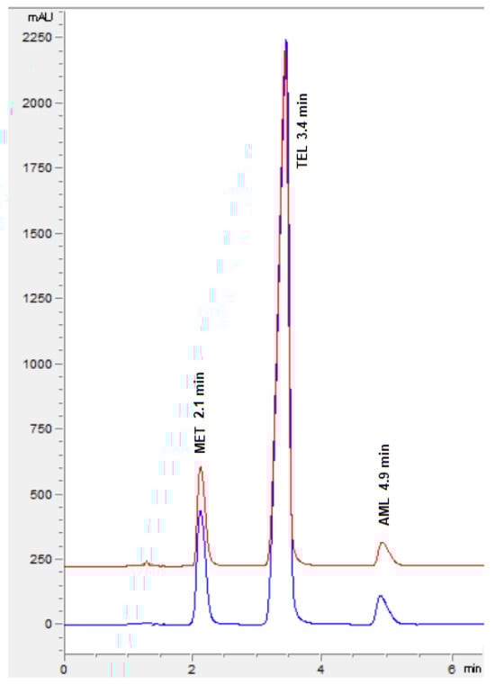 Representative chromatogram of MET, TEL, and AML for standard solution (blue) and formulation (red).