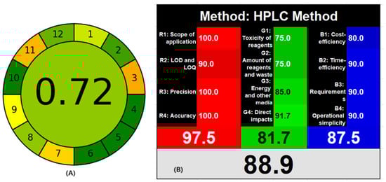 AGREE (A) and white analytical chemistry whiteness (B) evaluation report for the proposed HPLC method.