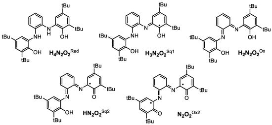 N,N′-bis(3,5-di-tert-butyl-2-hydroxyphenyl)-1,2-phenylenediamine (Figure 2, H4N2O2, from here on N2O2 corresponds to the deprotonated ligand in any oxidation state) was first reported in 1999 by Wieghardt et al. It was originally synthesized to prepare Cu and Zn complexes, which can engage in homogenous catalysis where alcohols are oxidized by molecular oxygen in an ambient atmosphere []. H4N2O2 can be considered as a top of the o-aminophenol-based non-innocent ligands as it combines two o-aminophenol moieties and exists in five protonation states as well as at five different oxidation levels, which range from the oxidation state of 0 to −4 (Figure 3). Electron delocalization in the molecule may also span over ten atoms, from one phenolic oxygen atom to another. The oxidation state of the ligand strongly affects the coordination properties, as the donor atoms can be considered either as neutral or anionic; therefore, the metal-to-donor distances may vary remarkably. Moreover, in its partially or fully oxidized forms, one or two N donors are sp2-hybridized, which makes the ligand planar, whereas in the reduced form, sp3-hybridized N donors allow the formation of more flexible chelate structures. As a result, the proligand H4N2O2 has gained attention from coordination chemists over the years, and it has proven its effectiveness, for example, in homogenous catalysis [,,,]. The proligand is synthesized and isolated separately, rather than in situ, to form complexes directly. Nevertheless, the synthesis is simple; i.e., two equivalents of 3,5-di-tert-butylcatechol are mixed with one equivalent of o-phenylenediamine in a basic hydrocarbon solution under ambient conditions []. In addition to the redox processes and the formation of radicals, H4L can undergo other structural reorganizations upon coordination [,].