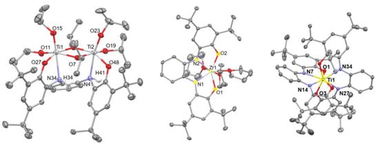 Molecular structures of (µ-H2N2O2Red)(Ti(µ-OR)(OR)2)2 (4) (left), Zr(N2O2Red)(thf)3 (8) (middle) and Ti(N2O2Ox)2 (13) (right). C-H hydrogens are omitted for clarity.