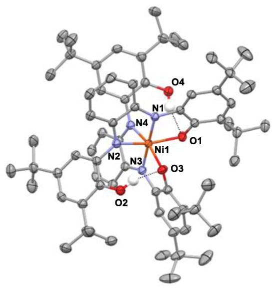 The Mn complex 19 is only briefly mentioned in one report, and no detailed discussions on the structure or the metal and ligand oxidation states were included []. However, the MOS calculations based on the geometrical parameters extracted from the single-crystal XRD data indicate an oxidation state of +III for the metal center, identical to the isostructural low-spin Fe(III) (20) and Co(III) (21) complexes [,]. In all these Mn, Fe and Co complexes, the ligands exhibit a HN2O2ox/HN2O2sq1 resonance structure; i.e., one ligand is oxidized by two electrons and the other ligand by one electron. Contradictorily, in the isostructural Ni complex, the two ligands are identical (Figure 6, Scheme 8). The shortest C-N bonds are towards the central phenylene ring of the ligand, corresponding to imine double bonds, so the Ni complex consists of one Ni2+ ion and two HN2O2Ox ligands. Actually, Ni(HN2O2Ox)2 (24) is isostructural and isomorphous with 22, which clearly demonstrates that the overall structure and geometry of the complex are not dependent on the oxidation level of the ligands.