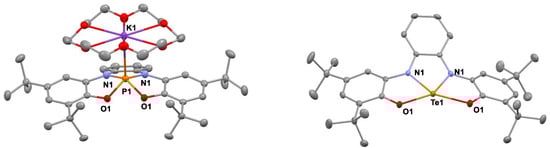 Molecular structures of K(18-crown-6)[P(N2O2Red)] (36) (left) and Te(N2O2Ox) (38) (right) [,].