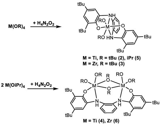 Roughly one half of all structurally characterized metal complexes of H4N2O2 are compounds of the group 4 transition metals Ti, Zr and Hf. They have been studied, for example, to find new catalysts for the polymerization of lactide to prepare biodegradable polymers derived from renewable resources [], whereas another known catalytic application for such complexes is the two-electron disproportionation of diphenylhydrazine to azobenzene and aniline []. In the syntheses of group 4 metal complexes, the nature of the metal precursors seems to have a crucial role in the reaction outcome. For example, M(OtBu)4 (M = Ti, Zr), which carry bulky alkoxide groups, react with H4N2O2 under inert conditions to give exclusively monomeric complexes with the formula of M(H2N2O2Red)(OtBu)2 (M = Ti (2), Zr (3)). However, when less sterically hindered alkoxide Ti(OiPr)4 is used under identical reaction conditions, two distinct complexes of different stoichiometries are formed depending on the reactant ratio. Specifically, a dinuclear complex (µ-H2N2O2Red)(Ti(µ-OiPr)(OiPr)2)2 (4) is formed with a 1:2 ligand-to-metal ratio, whereas the mononuclear Ti(H2N2O2Red)(OiPr)2 (5) can be obtained using a stoichiometric amount of the metal alkoxide and ligand (Scheme 2). Interestingly, these complexes can be easily converted to each other, i.e., adding one equivalent of Ti(OiPr)4 to the solution of 5 yields the dinuclear complex 4, whereas adding one equivalent of H4N2O2 to the dinuclear 4 yields the mononuclear complex 5. The oxidation state of the metal center remains at +4, so there are no redox processes associated with these transformations []. Noteworthily, in both kinds of complexes, the H2N2O2 ligand is bonded in the reduced dianionic form; thus, these are rare examples where the N donors of the ligand are sp3-hybridized so they can be rather freely arranged around the metal centers. In further studies, the monomeric complexes were used as active catalysts for the polymerization of lactic acid, whereas the dinuclear complexes were less active [].