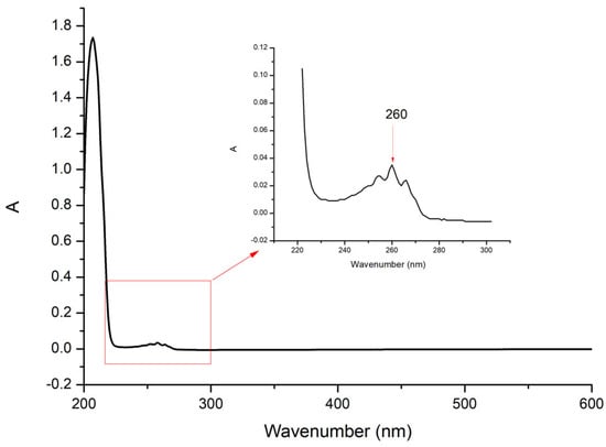 The detector in this experiment was an ultraviolet detector (UV). Using methanol as a reference solution, an appropriate amount of methamphetamine was dissolved and diluted with methanol and then scanned in the wavelength range of 200~600 nm; the resulting absorption spectra are shown in Figure 1. From the figure, it can be seen that methamphetamine has its maximum absorption at a wavelength of 207 nm, but the terminal absorption at 207 nm is larger. However, considering the large absorption of the mobile phase at 207 nm, λ = 260 nm was selected as the UV detection wavelength for HPLC. Common HPLC detectors include ultraviolet-visible spectrophotometers, electrochemical detectors, fluorescence detectors, and MS [48]. HPLC-FL is more sensitive than HPLC-UV, and the limit of detection (pg on the column) is usually two orders of magnitude higher; however, the analysis time is shorter in HPLC-UV compared to HPLC-FL, and it is universally accessible for any laboratory HPLC-UV system, which is an important advantage of HPLC-UV.