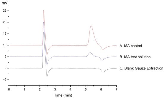 Chromatograms obtained from different carriers: (A) MA control, (B) MA test solution, and (C) blank gauze extraction.