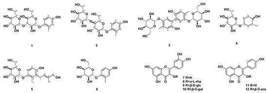 - Chang, J.; Inui, T. Novel phenolic glycoside dimer and trimer from the whole herb of Pyrola rotundifolia. Chem. Pharm. Bull. 2005, 53, 1051–1053. [Google Scholar] [CrossRef][Green Version]