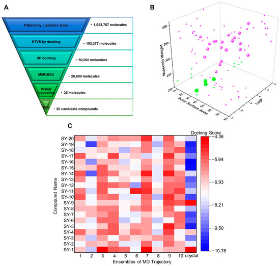 Structure-based virtual screening for novel α2A-AR agonists. (A) Workflow of virtual screening in Chemdiv library; (B) LogP, molecular weight and PSA comparison of candidate compounds (pink) with known α2A-AR ligands (green); (C) docking scores of 20 molecules for each cluster.