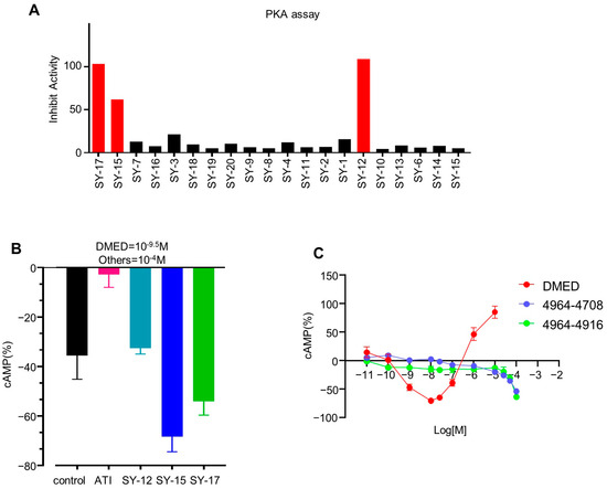 Biological evaluation for candidate compounds based on PKA and cAMP assays. (A) Effect of 20 compounds in PKA redistribution assay; (B) preliminarily biological evaluation on cAMP assay in vitro for candidate compounds; (C) the dose–effect of SY-17 and SY-15 in regulating cAMP levels.