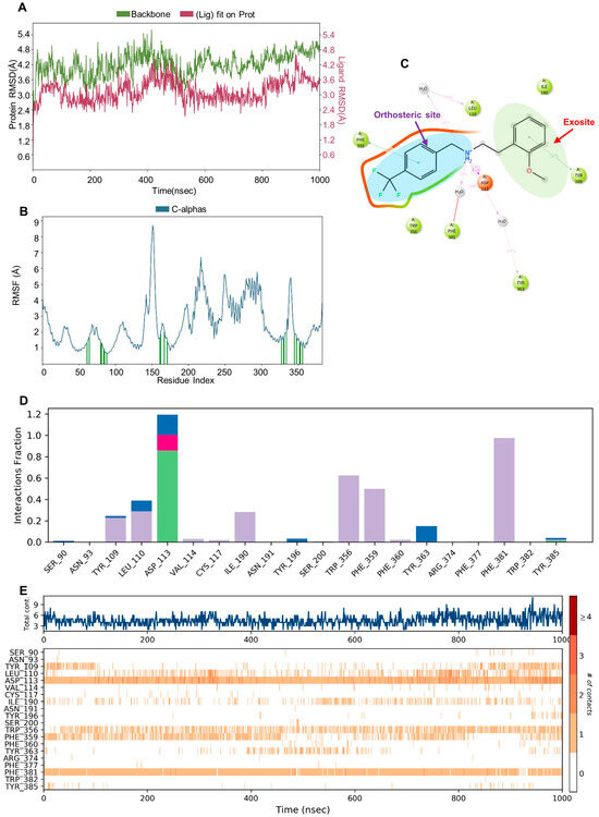 Additionally, the blue-colored plot indicated that an average of 4–5 residues were in contact with SY-17 during the whole 1000 ns simulation. Residues involved in more than one interaction with SY-17 were colored with darker shades of orange (Figure 6E). Asp113 and Phe381, which are shown with orange shades, were maintained throughout the simulation, suggesting the specific and consistent binding of SY-17 to α2A-AR active site.