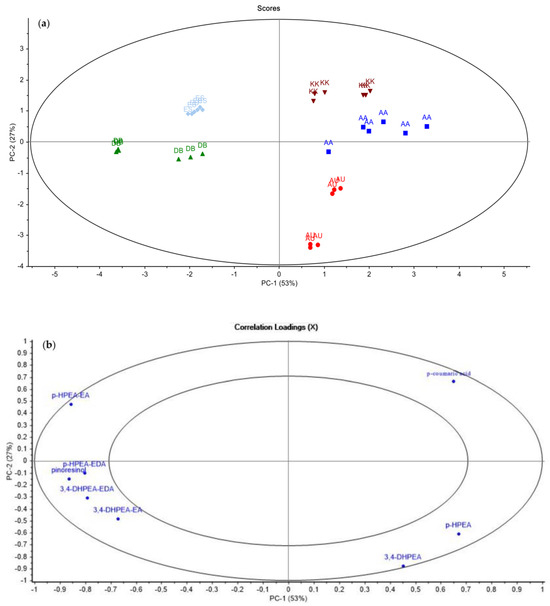 The initial two principal components derived from the PCA analysis utilizing phenol composition data elucidated a cumulative variance of 80%, accounting for the dissimilarities observed among the samples. This was depicted in the score plot (Figure 1a). In the score plot (Figure 1a), it can be seen that the oils of the KK, AA, and AU regions are easily separated from the other sample groups on the positive side of the PC1 axis. When the distributions of the variables in the loading plot of PCA were analyzed, it was seen that this separation was due to simple phenols. In particular, it was observed that QC samples were clustered in the positive region of PC1 and PC2, and it is thought that p-coumaric acid is effective. As seen in Table 2, the coumaric acid content of the KK group was found to be significantly higher than the other groups (p < 0.05). Similar to these results, Korkmaz [34] reported that regional differences in phenolics of different varieties from olive oils obtained from different regions of Turkey appeared to be distinctive in PCA analysis. ES samples were clustered in a different position from the other sample groups in the score plot, with PC2 in the positive and PC1 in the negative part of the score plot. This is thought to be the effect of p-HPEA-EA. The results shown in Table 2 support this conclusion.