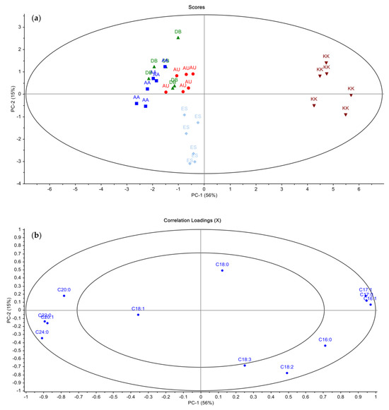 PCA score (a) and loading plots (b) for fatty acid composition data.
