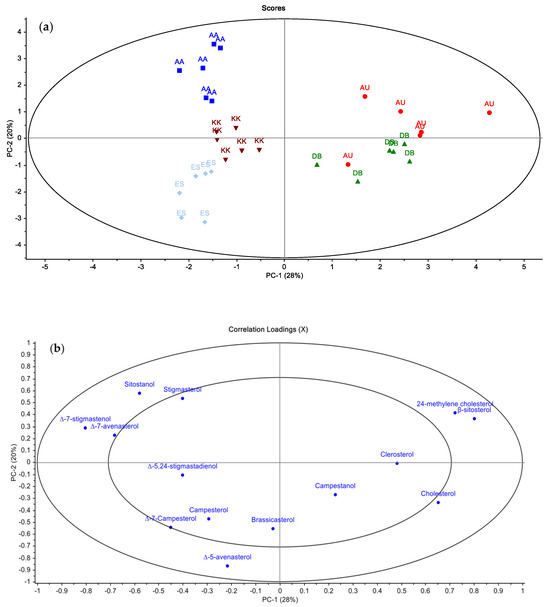 Sterol composition reliably assists in the classification of olive oil. The data depicted in Figure 3 demonstrate a discernible pattern where the score and loading plots reveal the existence of two primary clusters based on PC1. Locations AU and DB exhibited distinct characteristics that set them apart from the other locations (Figure 3a). The observed disparity is likely attributable to the variations in altitude between the locations. Conversely, PC2 offers additional differentiation among the groupings ranging from AA to ES. In line with our investigation, it was noted that the sterol composition of olive oils sourced from various provinces in Turkey varied according to geographical factors [51]. Upon completion of PCA, the power analysis of the modeling results revealed that β-sitosterol, Δ5-avenasterol, Δ7-campesterol, Δ-7-avenasterol, campesterol, Δ-7-stigmastenol, sitostanol, and 24-methylene cholesterol are the most influential variables in distinguishing between olive oils, as evidenced by the loading plot depicted in Figure 3b. As in the fatty acid composition, in the sterol composition, ES samples were clustered on the negative side of PC2 and PC1 in the score plot and at a different position from the other sample groups. Sitostanol and stigmasterol contents were found to be essential variables in characterizing the olive oil samples collected from the AA region, and campesterol and Δ7-campesterol emerged as particularly significant variables for characterizing the olive oils from ES. Typically, it can be concluded that the sterol compositions of β-sitosterol, Δ-5-avenasterol, campesterol, cholesterol, stigmasterol, clerosterol, and Δ-7-stigmastenol were utilized as the primary components in olive oil used to verify the authenticity of PDO olive oil and to characterize various olive oils, aligning with the existing literature [52].