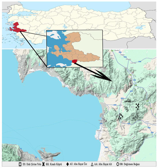Sixty monovarietal VOO samples obtained from Memecik olive cultivars representing the 2019–2020 and 2020–2021 harvest seasons from 5 different regions (ES: Eski Şirince Yolu, KK: Kınalı Köprü, AU: Abu Hayat Üst, AA: Abu Hayat Alt, and DB: Değirmen Boğazı) of the Selçuk district were obtained from the Selçuk Chamber of Commerce (6 orchards × 5 districts × 2 crop seasons). Twelve samples were collected over two seasons, with six samples collected from each region during each season. In order to reduce the seasonal effect only in PCA models, our models were created by randomly selecting six samples from a total of twelve samples from each region. Thus, PCA models were created for 30 samples from 5 regions. The geographic coordinates of each olive oil group from different regions are shown in Figure 4—all samples were produced in dual-phase centrifugation systems. After filtration, the VOO samples were poured into glass amber bottles, and the headspace was purged with nitrogen before sealing the lids. The samples were then placed in a freezer at −24 °C for subsequent analysis.