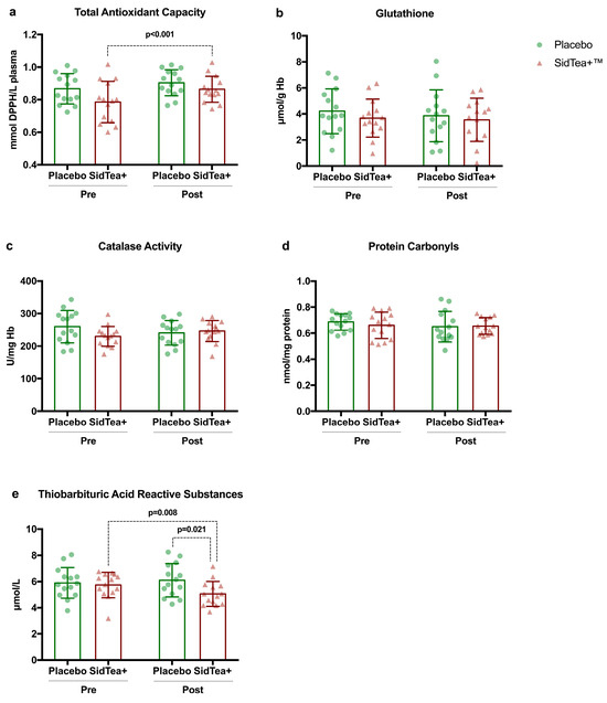 (a) Total antioxidant capacity—TAC; (b) glutathione; (c) catalase activity; (d) protein carbonyls; (e) thiobarbituric acid reactive substances—TBARS at baseline and following SidTea+TM and placebo supplementation.