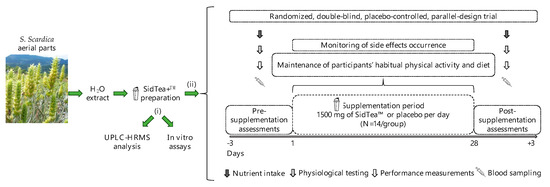 For the SidTea+TM extract production, S. scardica aerial parts were collected from local producers in the Greek mountain region of Taygetos, and the plant extract was prepared following standardized procedures. Following SidTea+TM production, the chemical profile of the extract was analyzed by ultra-performance liquid chromatography coupled with high-resolution mass spectrometry (UPLC-HRMS). The Total Phenolic Content (TPC) and the DPPH radical scavenging capacity of the extract were also determined by in vitro cell-free methods. A preliminary power analysis [55] based on the design of the study and adjusted for a medium effect size and within–between interactions indicated a total sample size of 28 participants (N = 14 per group), for a power of 80%. Initially, 30 healthy adults (15 men and 15 women) participated in this randomized, double-blind, placebo-controlled, parallel design study, but after randomization, 2 participants dropped out due to personal reasons. Exclusion criteria for the study included the following: (a) presence of cardiovascular, liver, renal, hematological or endocrine diseases, (b) musculoskeletal injury, (c) consumption of vitamin, mineral or dietary supplements for more than 3 months before as well as during the study, and (d) allergies. Participants were randomly allocated by a researcher not involved in data collection and analysis using the random table method to either a SidTea+TM or a placebo supplementation group (SidTea+TM: 6 men, 8 women, 39.5 ± 13.9 years; placebo: 8 men, 6 women, 42.1 ± 11.6 years) and they consumed 1500 mg/day of SidTea+TM or placebo, distributed in three equal doses (every 8 h) for 4 weeks. Both the participants and researchers assessing outcomes were blinded to the supplementation group. After enrollment, participants were instructed to continue their habitual physical activity and diet, maintaining the same levels of consumption of fruits, vegetables and plants, and avoiding the consumption of flavonoids or herbal beverages during the study period. Participants were instructed by a registered dietician (author K.G.) on how to record their diet for 3 days before the study and asked to follow the same dietary pattern for 3 days before the post-supplementation assessments. During the pre-supplementation assessments, participants visited the laboratory two times. During their first visit, anthropometric (body mass, body height, body mass index, body fat, waist, and hip circumferences) and physiological measurements (resting heart rate and blood pressure) were performed. During their second visit to the laboratory, the first blood sample was collected and participants had their handgrip strength and VO2max (indirect estimation) assessed. Participants were then given the exact amount of pre-packed SidTea+TM or placebo (according to the allocation sequence), which they were instructed to consume daily for the following 4 weeks. At the end of the 4-week supplementation period, participants returned to the laboratory and underwent the same assessments (in the same order) as the pre-supplementation period. Figure 3 shows the experimental design of the study, Figure 4 depicts the CONSORT flow diagram and Table S1 contains the CONSORT checklist of the information reported in the present randomized trial.