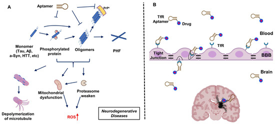 In concept, aptamers, have a number of advantages over antibodies, including lower immunogenicity, smaller physical size, and better permeability [21]. Aptamers have evolved to bind neurologic disease-relevant proteins, inhibit neurodegenerative events resulting from PTM (e.g., phosphorylation), and/or prevent aggregation (Figure 1A). On the other hand, the transfer of biological molecules across the blood–brain barrier (BBB) remains the most challenging obstacle to treat brain diseases. On this front, exploiting the transferrin receptor (TfR) binding aptamer moiety provides a potentially viable path to the delivery of neuroactive aptamers or other drug molecules across the BBB (Figure 1B).