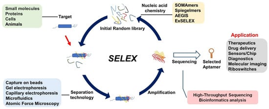 The first categorization of SELEX is based on the classification of targets, where different responses are observed for small molecules [26,27] (biological molecules, food, environmental toxins, fluorophores, and synthetic pharmaceuticals), proteins [28] (mammalian proteins, infectious agents, others), cells [29] (cancer cells, pathogenic microbes), whole viruses [30], and tissues or animals [31].