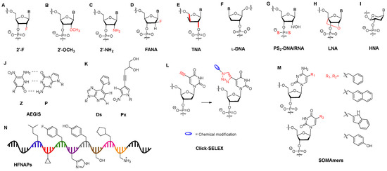Chemical modifications of DNA or RNA building blocks for aptamers. (A) 2′-deoxy-2′-fluoro modification; (B) 2′-deoxy-2′-methoxy modification; (C) 2′-deoxy-2′-amino modification; (D) 2′-deoxy-2′-fluoroarabino nucleic acid; (E) TNA, α-L threose nucleic acid; (F) Spiegelmers (L-DNA); (G) phosphonodithioates (PS2); (H) locked nucleic acid (LNA); (I) 1,5-anhydrohexitol nucleic acid (HNA); (J) Artificially Expanded Genetic Information System-SELEX; (K) Genetic alphabet Expansion for SELEX (ExSELEX); (L) Click-SELEX; (M) Slow Off-rate Modified Aptamers (SOMAmers); (N) Highly functionalized nucleic acid polymers (HFNAPs).