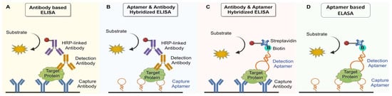 The setup of sandwich ELISA assay. (A) Classical antibody-based ELISA. The target protein is measured using two primary antibodies, a capture antibody and a detection antibody, followed by detection via HRP-linked antibody. (B) Antibody and aptamer hybridized ELISA. Capture antibody is replaced by capture aptamer. (C) Aptamer and antibody hybridized ELISA. The detection antibody is replaced by a biotinylated detection aptamer, which is recognized by HRP-streptavidin. (D) Aptamer-based ELASA. The target protein is measured using capture aptamer and biotinylated detection aptamer, followed by detection via HRP-streptavidin.