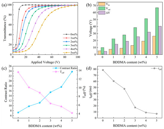 The effect of cross-linker (BDDMA) content on electro-optical properties: (a) voltage-transmittance curve; (b) threshold voltage (Vth), saturation voltage (Vsat), and ΔV; (c) contrast ratio (CR) and off-state transmittance (Toff); (d) response time (toff).
