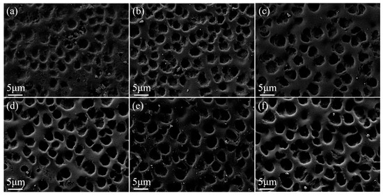 SEM images of PDLC cells. (a) 0 wt% BDDMA; (b) 1 wt% BDDMA; (c) 2 wt% BDDMA; (d) 3 wt% BDDMA; (e) 4 wt% BDDMA; (f) 5 wt% BDDMA. 3000× magnification.