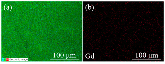 The EDS map of the sample with the optimal Gd2O3 nanoparticle content (b2) is shown in Figure 8. According to the Gd elemental distribution, the Gd2O3 nanoparticles are more uniformly distributed. In addition, the agglomeration of Gd2O3 nanoparticles is not obvious, which is a prerequisite for maintaining PDLC’s excellent performance.