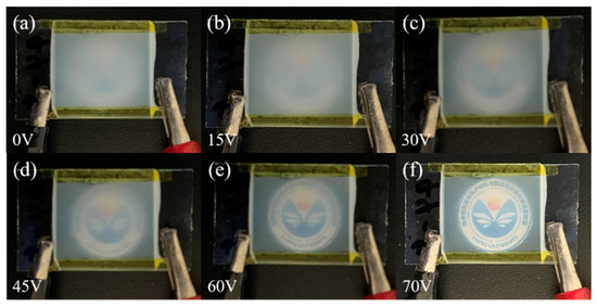 The physical plots of the transmittance variation of bilayer PDLC doped with rhodamine B base under UV irradiation at different voltages are demonstrated in Figure 14. With the increase of voltage, the transmittance of the bilayer PDLC increases gradually and the pattern at the bottom is clearer, which indicates that the bilayer PDLC sample has favorable progressive driving performance. In addition, due to the fluorescence effect of rhodamine B base, the color of the pattern through the sample changed accordingly.