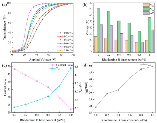 The effect of Rhodamine B base content on electro-optical properties. (a) Voltage-transmittance curve; (b) threshold voltage (Vth), saturation voltage (Vsat), and ΔV; (c) contrast ratio (CR) and off-state transmittance (Toff); (d) response time (toff).