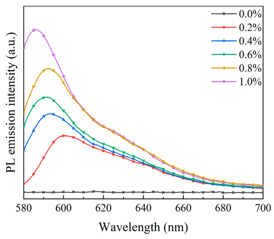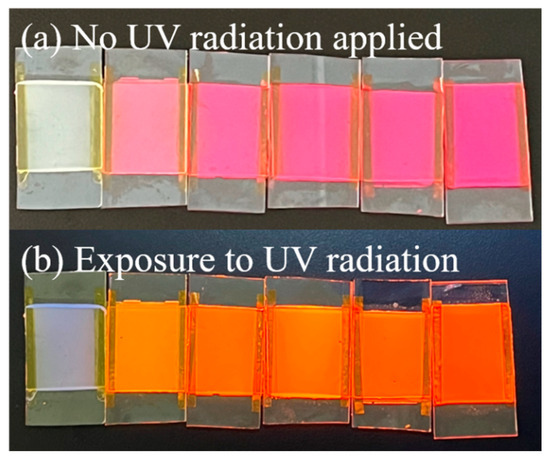 The fluorescence emission spectra and visual pictures of bilayer PDLC samples doped with different rhodamine B base percentages are depicted in Figure 12 and Figure 13, respectively. There was a marked upward trend in the fluorescence emission intensity of bilayer PDLC samples as the rhodamine B base content increased. Additionally, there was a series of emission peaks within the metering range, positioned at 590 nm. Compared to no UV irradiation, the samples’ orange coloration becomes more pronounced with the increase in rhodamine B base levels, as shown in the physical diagram in Figure 13. One explanation for this is that adding rhodamine B base to PDLC caused a strong fluorescence intensity, which was enhanced by increased fluorescent dye content.