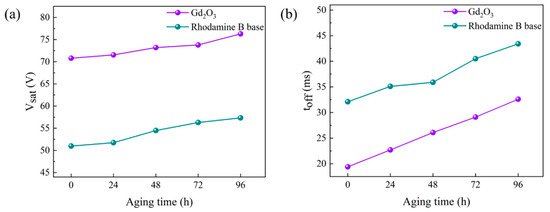 The prepared bilayer PDLC samples b2 and c3 were tested for aging resistance in a long-term high temperature (50 °C) and strong UV (830 mW/cm2) environment. The test samples were subjected to multiple tests at high temperatures and under UV light to test their electro-optical properties. Specific changes in Vsat and toff are shown in Figure 15, which both increase with aging time. The rate of change in samples doped with rhodamine B base was less than the undoped ones, suggesting that doping with rhodamine B base helps PDLC performance under extreme conditions and has a better lifetime. The presence of rhodamine B base absorbs UV light and converts it to orange light, thereby reducing the damage caused by UV light to the polymer network and providing endless possibilities for future developments.