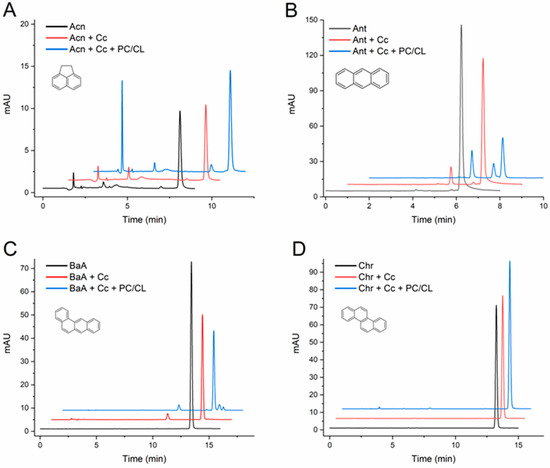 At this point, it was important to extend the study and evaluate the effect of the CL-containing membranes with a larger series of PAHs. Table 1 summarizes the quantification of the changes observed in the assays with five more PAHs: acenaphthene, anthracene, BaA, chrysene, and BbF. Representative chromatograms from the assays are presented in Figure 2, and for BbF in the abstract published before [38]. The results clearly indicate that Cc was unable to transform chrysene, whereas it catalyzed the conversion of the other PAHs into two or more products each. Moreover, the vesicles made of a mixture of PC and CL enhanced the Cc-mediated transformations, as evidenced by the decrease in the chromatographic peaks of the original PAH and/or by the notable emergence of reaction product peaks repeatedly observed in the chromatograms.