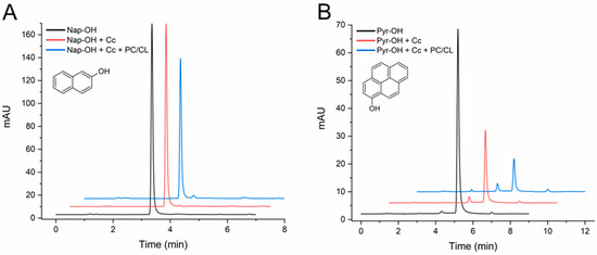 HPLC chromatograms of 2-hydroxynaphthalene (A) and 1-hydroxypyrene (B) transformation assays by cytochrome c (Cc) in the absence and in the presence of PC/CL small unilamellar vesicles. Chromatograms are shown for controls of each compound (1 mg/L) incubated in the absence of Cc, the compound with Cc 0.01 mg/mL, and with and without PC/CL vesicles (200 µM). All assay media included 100 µM H2O2 in 20 mM phosphate buffer pH 7.0 and were incubated for 4 h at 37 °C. The chromatograms are displaced in the vertical and horizontal axes for better observation. The chromatograms shown are representative results of triplicate assays for each reaction condition. The molecular structures of the compounds are depicted.