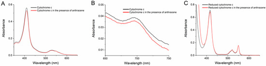 Spectra of cytochrome c (Cc) in the UV-visible region (A,C) and in the near-infrared region (B) in the absence and in the presence of anthracene. The concentration of Cc was 5 µM in panels (A,C), and 50 µM in (B) in 20 mM phosphate buffer pH 7.0. Anthracene was added to the Cc solutions reaching equimolar concentrations, and spectra were collected after 2 min of incubation. In panel (C), Cc in the absence and in the presence of anthracene was reduced with dithionite, as indicated in the Methods.