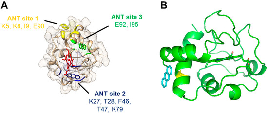 Docking of anthracene to cytochrome c (PDB 1HRC) as predicted by molecular simulations: (A) General view of the three predicted binding sites of anthracene to cytochrome c. Cytochrome c backbone and surface are shown in light brown, and the heme group in red. Anthracene molecules interacting with its modeled binding sites 1, 2, and 3 are shown in yellow, dark blue, and green, respectively. (B) Detail of the first pose of the top-ranked models of anthracene docked at cytochrome c (site 1). The location of an anthracene molecule (labeled in blue) interacting with cytochrome c (backbone and heme in green) is depicted in relation to the location of cytochrome c’s Glu90 residue (labeled in yellow).