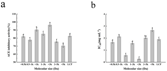 The ACE-inhibitory activity of the fractions with different molecular weights and Larimichthys crocea protein hydrolysate (a). The IC50 values of different molecular weights and Larimichthys crocea protein hydrolysate (b). Different letters on the same figure indicate significant differences (p > 0.05). The values represent the average of n = 3, and the standard deviation of each test result is represented by an error bar.