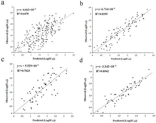 QSAR modeling was performed to investigate the relationship between observed and predicted values of active peptides, including tripeptide (a), hexapeptide (b), heptapeptide (c), and octapeptide (d).