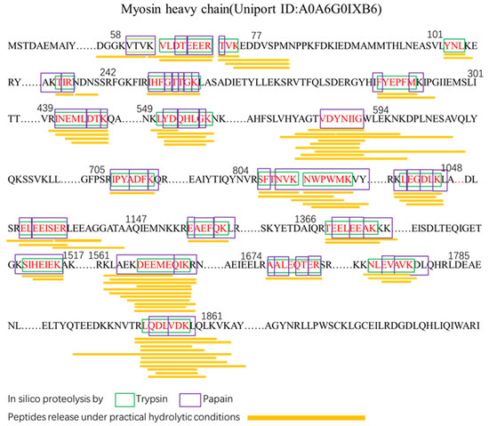 Larimichthys crocea’s representative protein myosin heavy chain (A0A6G0IXB6) was acquired from the UniProt database (https://www.uniprot.org/, accessed on 7 January 2023). Trypsin and papain were selected with the “Enzyme action” tool of the BIOPEP-UWM database (http://www.uwm.edu.pl/biochemia/index.php/pl/biopep, accessed on 9 January 2023) for combined hydrolysis, and the peptides obtained by hydrolysis were sorted and classified.
