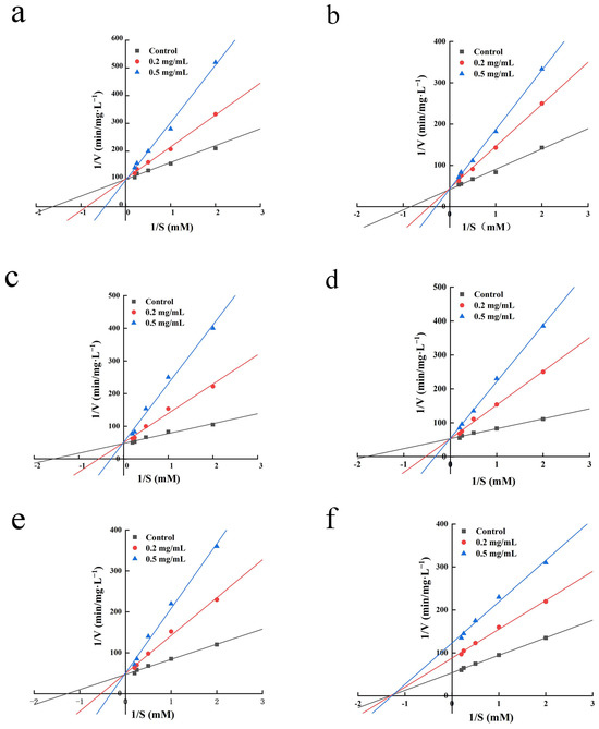 Lineweaver–Burk plots of ACE inhibition for IPYADFK (a), LYDHLGK (b), INEMLDTK (c), IHFGTTGK (d), NWPWMK (e), and FYEPFM (f).