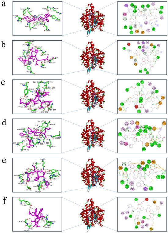 The 3D structures, overviews, and 2D representations of the best docking sites for peptides in molecular docking: IPYADFK (a), LYDHLGK (b), INEMLDTK (c), IHFGTTGK (d), NWPWMK (e), and FYEPFM (f). Peptides are labeled in purple, amino acid residues at the ACE docking site are labeled in green, and hydrogen bonds are labeled in red (where the numbers indicate the length of the hydrogen bonding force). The green dotted lines in the 2D diagrams are hydrogen bonds.
