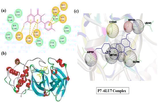 Two-dimensional (a), three-dimensional (b), and residue interactions analysis (c) based on structures of P-7-6LU7 complex.