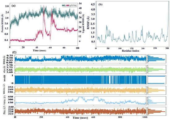 As kaempferol from Carica papaya showed significant interactions with the target protein of COVID-19 in the experimental [41] and molecular docking study, so this compound was selected for further MD simulation. The stability of a protein–ligand complex was assessed using molecular dynamics (MD) simulations in a system under Na+ 33 (57.676 Mm) and 29 (50.685 Mm). Using Schrodinger’s Desmond molecular dynamics modeling program, the optimum compound, P-7-6LU7, was studied [42]. The OPLS_2005 force field was utilized to simulate the complex interactions between the protein and ligand. To ensure the accuracy of simulations, the complex was placed in a cubical water box (TIP3P water model), in three dimensions, with a 12 Å buffer space using Desmond’s system builder tool. Appropriate counter-ions were added to neutralize each system and were maintained by adding 0.15 M NaCl, ensuring a stable and consistent environment. With 10,000 steepest descent steps, the systems were minimized and gradually heated from 0 to 300 K, using NVT before each run. To ensure optimal results, the system was then thermally relaxed for 5 ns, using the Nose–Hoover Chain thermostat and Martyna–Tobias–Klein barostat methods for 5 ns of pressure relaxation. This was followed by keeping the constant particle number (N) at 4691 (total), heavy atoms at 2372, charge at −4, pressure (P) at 1.01325 bar, and ensemble conditions (NPT ensemble). The NPT ensemble was used to simulate 100 ns with a cutoff distance of 12 angstroms. To record the trajectories, 5000 frames were captured and saved at 4.8 picosecond intervals.