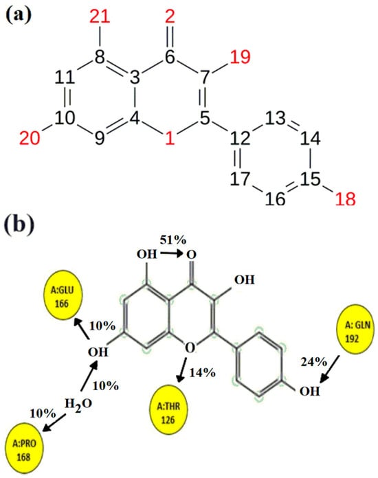 (a) Represent the numbering scheme of the Kaempferol P-7 and (b) represent interactions of the functional groups within the P-7 ligand with the specific amino acids of the protein.