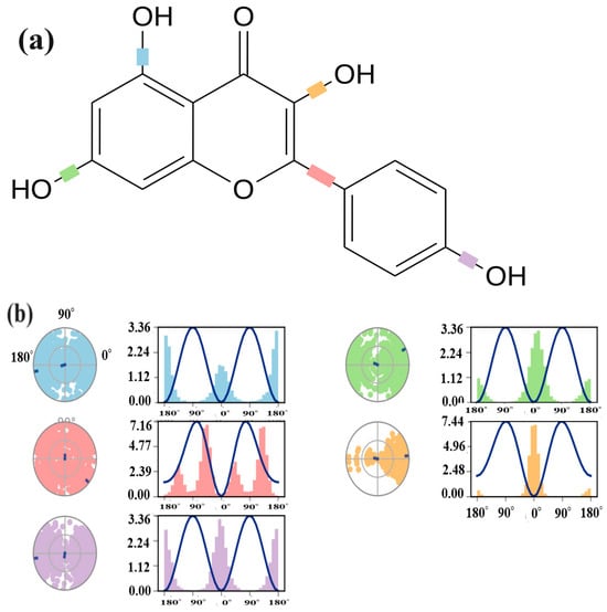 The torsional degree of freedom refers to the rotation around the single bond within the molecule. It allows the ligand to adopt an optimal orientation for binding to the protein. The values for the torsional degree were calculated for the P-7-6LU7 complex. During the trajectory simulation, variations in specific bonds within the ligand were observed. As shown in (a) part of Figure 7, four C–O and one C–C bond exhibited variations in the torsion conformation within the ligand during trajectory simulation. Bonds between atoms 8 and 21 exhibited three distinct conformations, while bonds between atoms 5 and 12 exhibited four distinct conformations, two with major and two with minor rotational angles. This result indicates the presence of distinct conformation adopted by kaempferol within the binding pocket of 6LU7. The potential differences between 8 and 21; 10 and 20; and 15 and 18 were 3.36 units, while the potential difference between 5 and 12 was 7.16. Atoms 7 and 9 exhibited one main conformation up to 40 degrees of rotation and 7.44 potential units, suggesting specific molecular arrangements that contribute significantly to overall binding affinity, whereas the other two conformations were minimal and possessed a potential change of only 0.1 units, indicating less stable binding modes (see Figure 7).