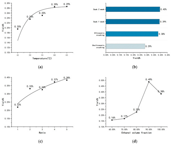 (a) Effect of temperature on the nicotine yield (%) of tobacco rhizomes; (b) effect of ultrasonic crushing and soaking on the nicotine yield (%) of tobacco rhizomes; (c) effect of the ratio of ethanol volume to the mass of materials on the nicotine yield (%) of tobacco rhizomes; (d) effect of ethanol volume fraction on the nicotine yield (%) of tobacco rhizomes.