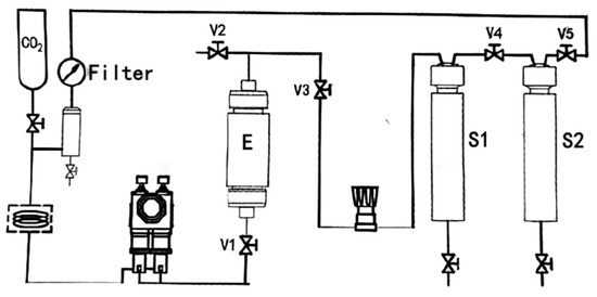 A schematic diagram of the supercritical CO2 unit used for extraction is shown in Figure 4. The sample was placed into the extraction kettle (E) and then pressurised and heated. The evaporated crude extract was then condensed and refluxed to the separation kettle (S1, S2).