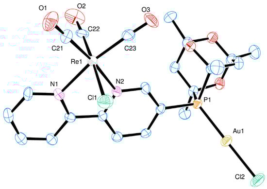 The molecular structure of 5LRe,Au, along with pertinent metrics, determined by SCXRD is shown in Figure 2. Both metal ions show their anticipated geometry and the AuCl fragment is directed away (anti) from the [Re(CO)3] core with the P–Au–Cl vector projecting at an angle of 131.7° with respect to the pyridine ring and orientated on the side of the Re(bpy)(CO)2 plane that contains the rhenium-bound chloride. This places the main bulk of the CgP unit in the region of space proximate to the CO group trans to the chloride, resulting in some distortion of the Re–C–O linkage to 169.7°. At 2.2177(14) Å, the Au–P bond length is in line with values seen in similar compounds, including the related complex of Smith et al. (2.2328(16), 2.280(2)) [39] and 2.2285(8) [43] and 2.2137(18) Å for those of Stradiotto and Newman, respectively [44]. It is noteworthy that the preferred geometry/configuration determined by DFT agrees with that shown in Figure 2.