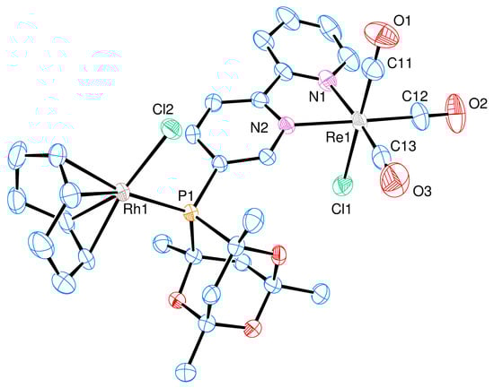 Ortep [45] representation of the molecular structure of anti-5LRe,Rh. Hydrogen atoms and residual solvent have been omitted for clarity. Selected bond lengths (Å) and angles (°): Re1—N1 2.173(3); Re1—N2 2.172(3); Re1—C11 1.902(6); Re1—C12 1.910(4); Re1—C13 1.908(5); Re1—Cl1 2.4563(18); Rh1—P1 2.3176(8); Rh1—Cl2 2.3580(8); N1—Re1—C13 171.67(14); N2—Re1—C12 173.15(15); Cl1—Re1—C11 179.1(2); P1—Rh1—Cl2 84.48(3).