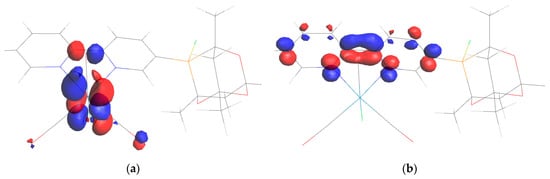 Frontier orbitals of 5LRe,Au. (a) The HOMO (−6.09 eV); (b) the LUMO (−2.66 eV).