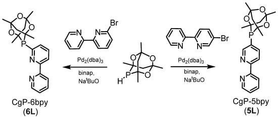 The ligands were synthesised by the C–P coupling chemistry highlighted in Scheme 1. In contrast to many derivatives, including the pyr–PCg analogue [41], 5L proved to be air-sensitive and the procedure had to be performed under strictly anaerobic conditions. Although far less susceptible to air oxidation in the solid state, as a precaution, the isolated white solid was stored under nitrogen. A single peak at δP −30.5 ppm was seen in the 31P{1H} NMR spectrum of 5L and all other spectroscopic data were in accord with the expected structure (see Supplementary Materials). Unlike 5L, 6L proved to be air-stable with no discernible oxidation being observed upon leaving non-degassed NMR samples in air for several weeks, as determined by the constant presence of a single peak at δP −25 ppm and the absence of any other signals in the 31P{1H} NMR spectrum of the compound. In both cases, there was no evidence of rotamers reflecting free rotation about the Cbpy–P bond on the NMR timescale.