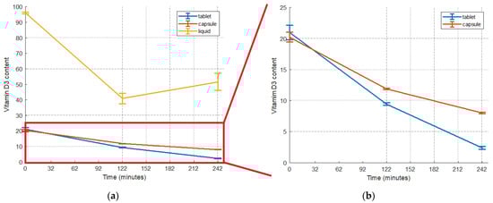 Detected vitamin D3 content during in vitro digestion of (a) commercial supplements: tablet; capsule; liquid. (b) Close view of tablet and capsule (tablet in μg/tablet, capsule in μg/capsule, and liquid in μg/mL). On x-axis, 0, 122, and 242 minutes refer respectively to the initial content, content after gastric stage, and content after intestinal stage.